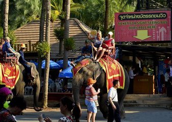 在泰国东芭乐园,大象正在用它的粗腿,为游客进行档部按摩