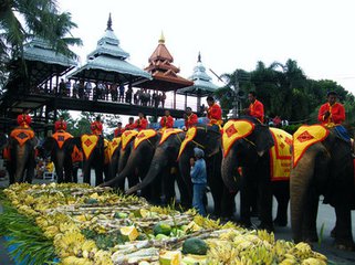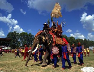 古战象队伍过后,驯象员开始向观众介绍象先生和象小姐了。当驯象员点名时,这些极通人性,学业优秀的大象们,听见叫到自己的名字时,便一个个抖起精神,扬起长鼻,对天摇动,并朝着看台的观众欢叫声声,然后频频地点头,以表达其对远方来宾的欢迎情意。