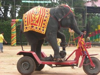 随之,吃过香樵的大象,大大方方地来到一台小小的滑板车旁,用那肥肥粗粗双足,踏在车头下方专门踏板上,然后将灵巧的鼻子落在圆圆的方向盘边,左脚踏在车后,用右足用力朝后一登,前右足把开关一点,那滑板车竟悠闲自在地在表演场上绕起圈来。