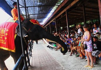 那轻柔的动作,那慈祥的态度,活像怀抱幼童的父母!那被大象揽在怀里的游客,刚开始时还战战兢兢的,生怕那大象突然失态,缠断了他们的骨头。及至走了一圈后,他们竟被悠忽得舒舒服服不想下来,于是,大象似乎会意地就又绕场一圈,过之后,被邀请的那些靓仔和美媚们,还会与那“不辞劳苦”的大象愉愉快快地合影留念。