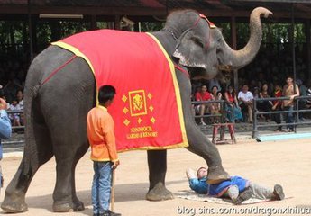 而后,这头大象慢慢走到观众身边,甩动着象鼻子,突然卷起一位观众的包包,用鼻子迅速搜出里面潜藏的香樵,边吃边点头致谢,弄得这位观众小姐十分尴尬地说:“这香樵藏得这么严,这个笨东西怎么知道的?我还没有逗它,竟被它全抢了,呵呵!”