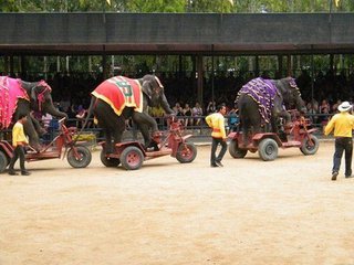 其间,有的大象乘游客不备,把那人手中的香蕉抢了就走;有的,还用那灵巧的象鼻子,像小偷一样,眼睛斜瞟着别处,象鼻子却悄悄地伸入了游客的口袋,快速地掏出游客的钱来,高高举起,逼着游客用香蕉去换取鼻上卷着的钞票;还有的象,以不停作揖,来讨赏钱,讨到赏钱后,若驯象员盯着,便老老实实地将钱上交,若驯象员不注意,便一溜烟地跑到围栏边的小摊前,买来香蕉火速解馋。惹得周围的游客一边捧腹,一边火速掏钱,以讨大象的欢喜。
