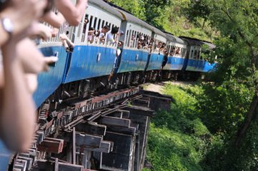 这条铁路到桂河桥处,便是一座连着一座奇险的山峰,该铁路中的不少路段,就开凿在那悬崖绝壁的边上,站在高高的桥架旁,俯视着脚下的桂河水,会感到一阵阵的晕眩。