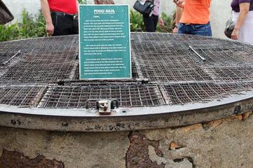 在“宝山亭”的院内一侧,还立着一座郑和的石像,但见身着官服的郑和,气宇轩昂,栩栩如生,这里就是华人供奉郑和的神位。宝山亭旁,有一口很大的古井,它的直径约有两米多宽,这口大井是郑和当年率领部下所挖掘,供士兵汲用的七口水井之一,人称“三宝井”。传说此井水清澈甘甜,数百年来,一直被当地人奉为圣水。