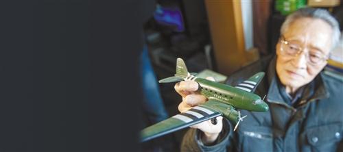 龙启明拿着一架抗日战争时期飞越驼峰航线的运输机模型追忆当年经历