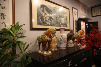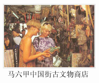 再往里面走,中国传统文化的色彩则更浓了,我们看到,一些古董店里的瓷器、木雕,尽是中华的老款式,它们甚至比今天中国大陆的样式、色彩更传统、更地道。