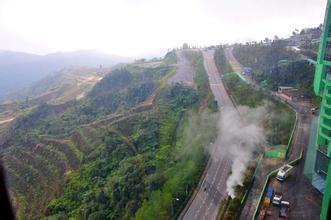 我们正在惊讶着眼前的美景,汽车一个急转弯,随着车,大伙已经跃上了千米高的山腰,乖乖!千米之上,盘山的路,仍是高速开进的四车道柏油公路!而且,分道的石磴护栏,居然是彩色的!它一直向上旋升着,直达近两千米高的山顶,这样的山道,在国内,我们何曾见过?