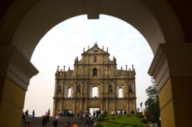 透过历史古老的拱门,看到的澳门大三巴,似乎更令人沉思