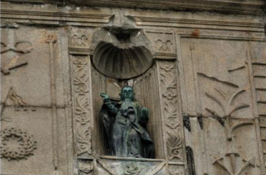 第二层,是圣殿精神的升腾层。10根壁柱及7朵玫瑰花浮雕装饰的3个拱形窗口,构成了它宗教浓深的遐想。那正中窗口的壁上,刻镂的“天主圣母”拉丁文字样,标出了天主精神行走的主轴线,窗口与壁柱间点缀的棕榈树,左右壁龛内供奉的4位天主教圣人像,则构成了天主精神升腾的簇拥,它让人在天主圣母的幻光下,逐渐渡入到宗教精神的追求之中。