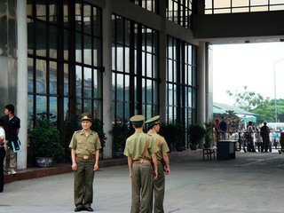不一会儿,一个身穿绿色军服的越南军官走了过来,他面无表情地逐个对比照片和面前的旅客审视着,时不时又对着电脑对了对,把那些用中文填写的表格退了回来,在英文填写的表格上“咔咔”地敲了几个章,就给我们签了证。跟着海关的一位女士,也在签证和表格上盖了章。然后,经过出门口的第三道关卡查验后,我们终于迈出了越南海关的大门。