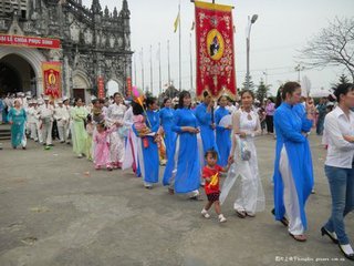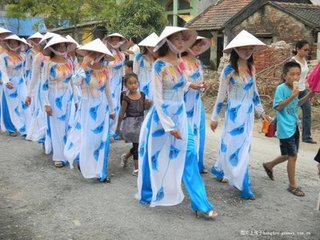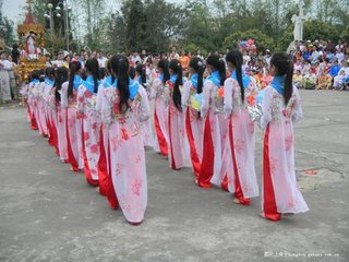 越南芒街市茶古哈节,妹子们身着奥黛服入场