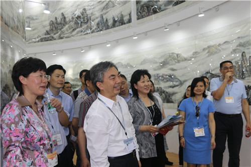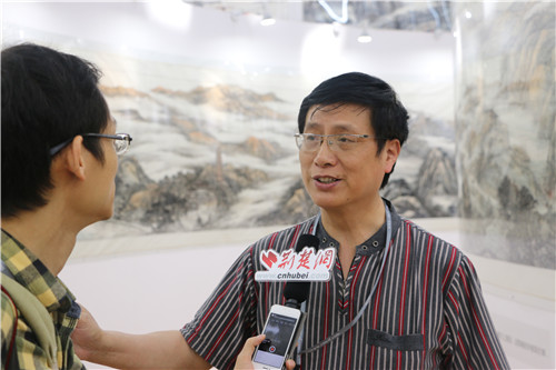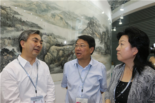 湖北省委宣传部部长梁伟年、武汉市委宣传部部长李述咏、武汉市副市长刘英姿和省市其他领导一行,在参观了湖北展馆参展展品,并仔细欣赏了用我院创作的《中华长江人文山水国画长卷》打造出的地下景观带后,在市旅游发展投资集团董事长董志向、总经理王斌的陪同下,兴致勃勃来到我馆,当他们一行看到我馆门前观众众多,其创作作品受到社会各界强烈关注和许多名师大家的高度赞誉时,立即向市旅游发展投资集团的领导表示祝贺。