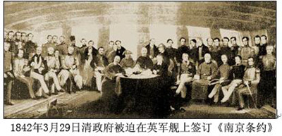 8月29日,关于结束历时三年整的鸦片战争的最后仪式,在英军装有174门大炮的旗舰“康华立司”号上进行。仪式进行的席位,设在军舰颇为宽大的中舱,正中一张圆桌,由璞鼎查、耆英、伊里布、牛鉴四人依次围坐,两旁的长凳上,则坐着级别较高的英国海陆军官,长凳后面,排列着装束整齐,将军帽捧在左手的英军侍卫。