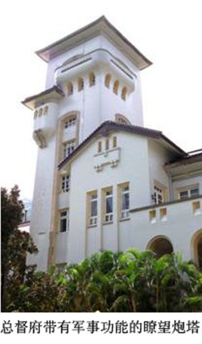 官邸的正中央是一座方形的六层塔楼,有人又称它为炮塔,正面弧形的拱卷,把一至四层楼宽大的窗户,连成了一个有机的整体。塔楼的左边,有一个凸起的方堡,它高高地、遙遙地、厚厚地镶缀在塔体上,一看就知道,它明显带有军事暸望的功能。再往上的一层,楼旁吊有厚实的阳台,塔楼顶上亦为紫色缓坡的日式屋顶。据汤导说,这一座塔楼,是日本第二次世界大战期间,占领香港后,由日治的港督聘请本国的工程师藤村正一设计后加建的,它的建成,不仅使原有白府的两栋楼房连成了一个整体,而且还新增加了它的军事功用和心理威慑的典型特征。