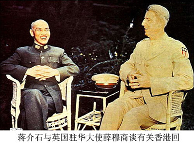 作为国难当头的蒋介石,为违心地作出如此的决策而心潮难平,由此,他在当天的日记中写道:“对英外交,颇费心神”,“九龙(租借地)交还问题,英坚不愿在新约内同时解决”,只得“暂忍之”,“待我签字之后,另用书面对彼说明,交还九龙问题暂作保留,以待将来继续谈判,为日后交涉之根据,”作为“最后手段”,“一俟战后,用军事手段(将九龙租借地)由日军手中取回。则彼虽狡猾,亦必无可如何。”