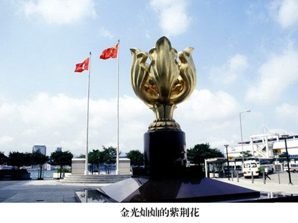 是啊,在他的旁边,就矗立着那朵世界闻名金光灿灿的紫荆花,那,就是中国香港特别行政区的象征,只有它,才包蕴了中国为收回香港所发生一个又一个动人的故事。